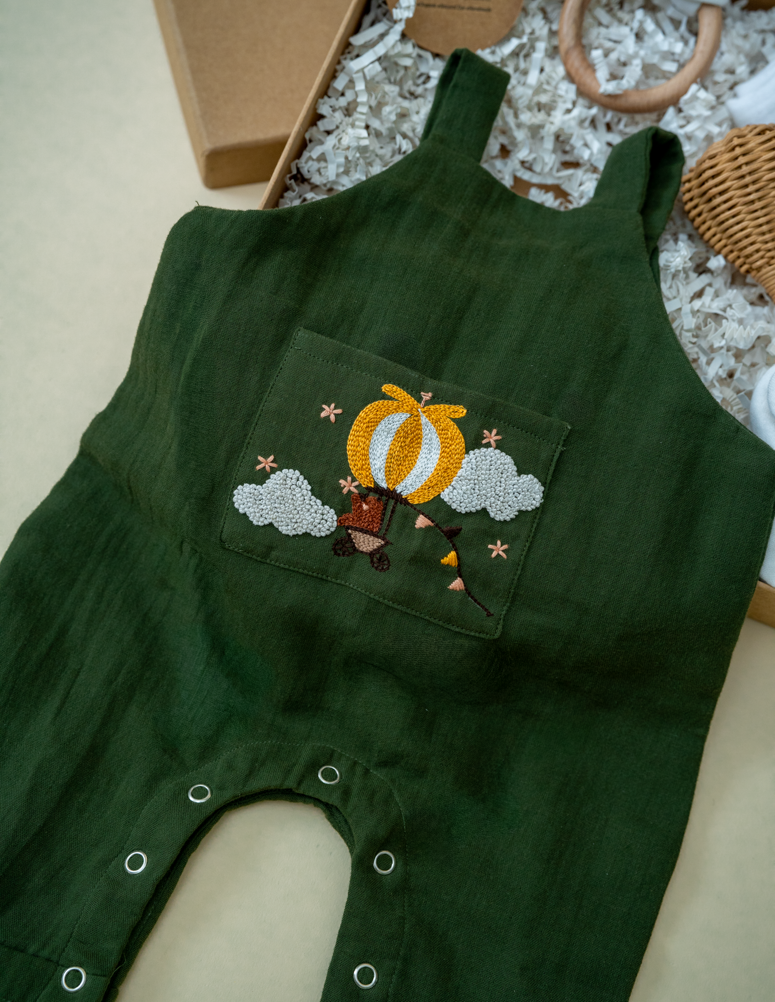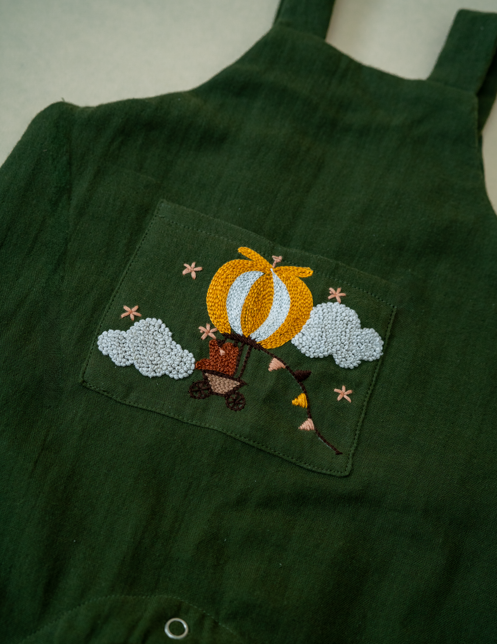Inspired by the spirit of tiny explorers, this charming piece features a beautifully hand embroidered hot-air balloon drifting through soft clouds—symbolizing curiosity, courage, and the joy of discovering something new every day.