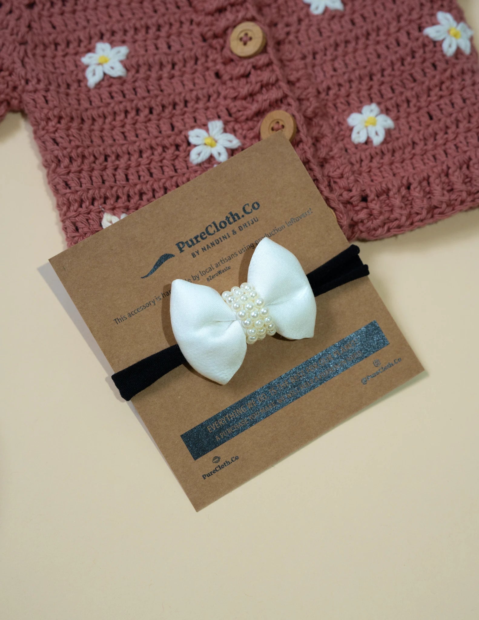 Handcrafted with love, this soft and lightweight bow sits gently on your baby’s hair without tugging or discomfort. The center pearl detailing lends a graceful, timeless charm — perfect for special occasions, photoshoots, or simply brightening up everyday moments.