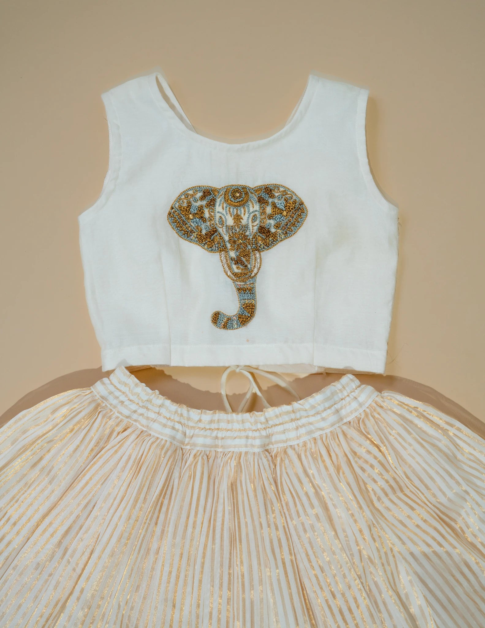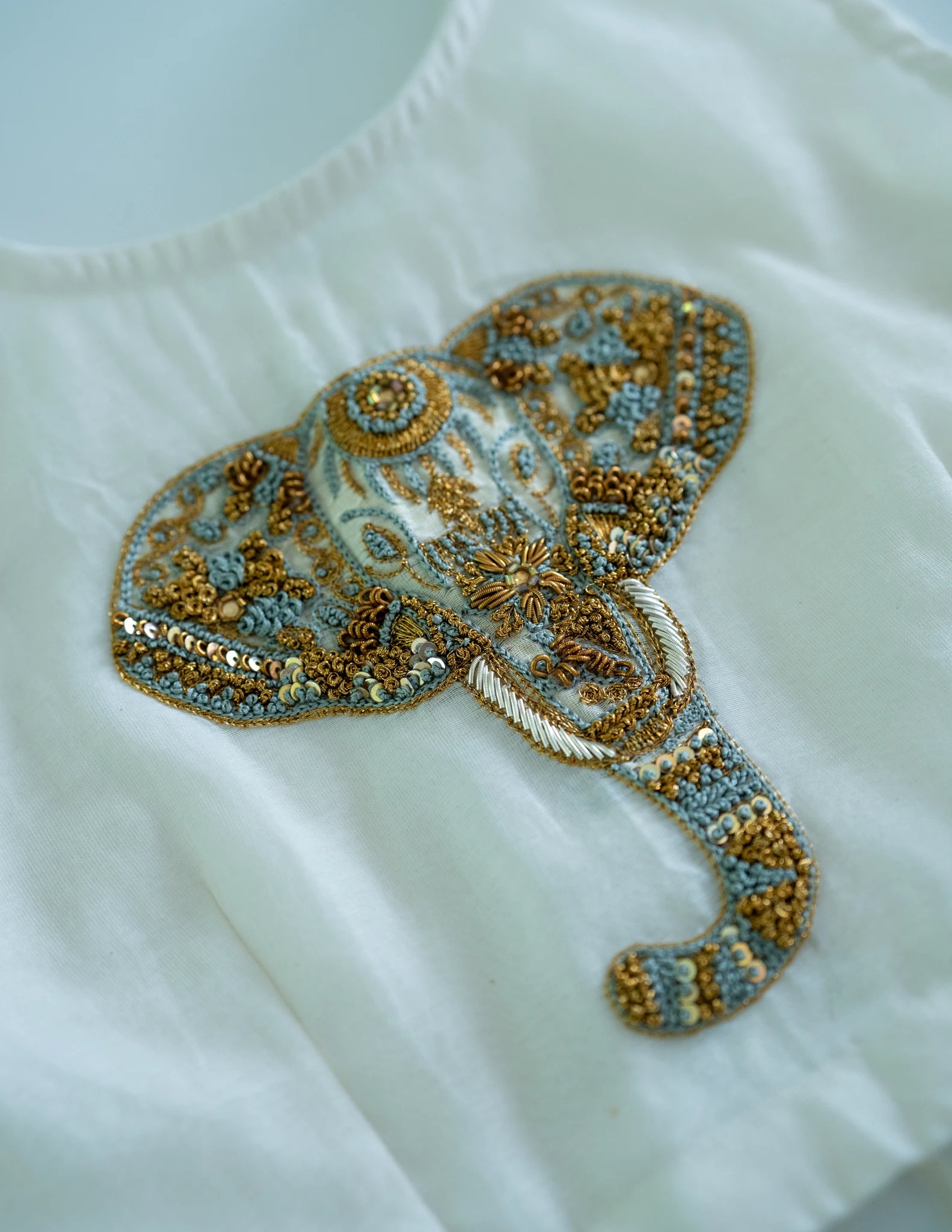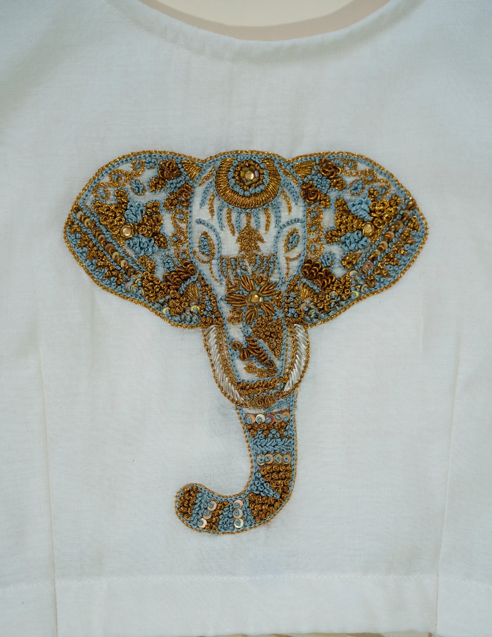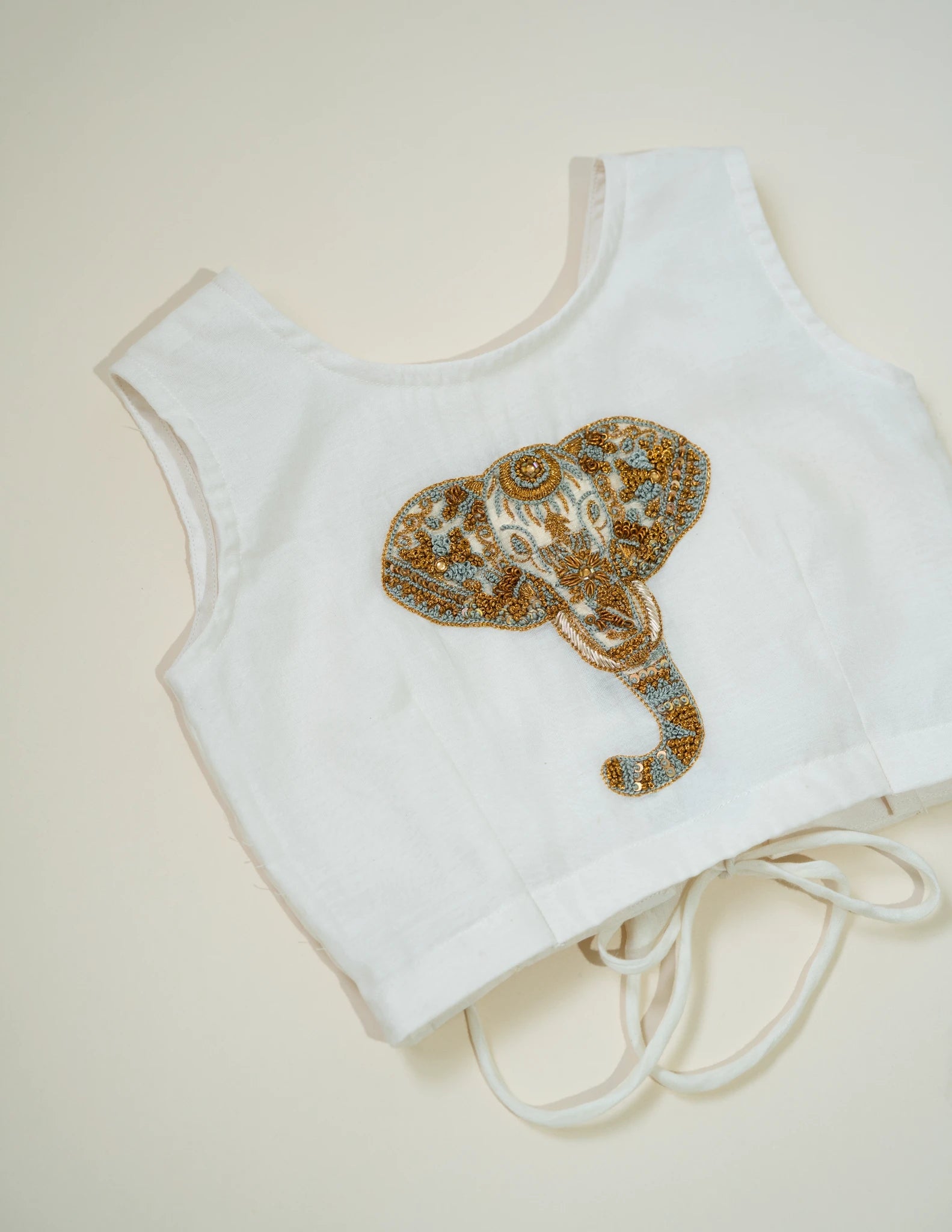 The blouse is crafted from lightweight Chanderi Silk and adorned with intricate hand-embroidered zardozi elephant motifs, celebrating heritage craftsmanship. A soft inner lining ensures comfort, while the back-tie detail adds both style and an adjustable fit as your child grows.
